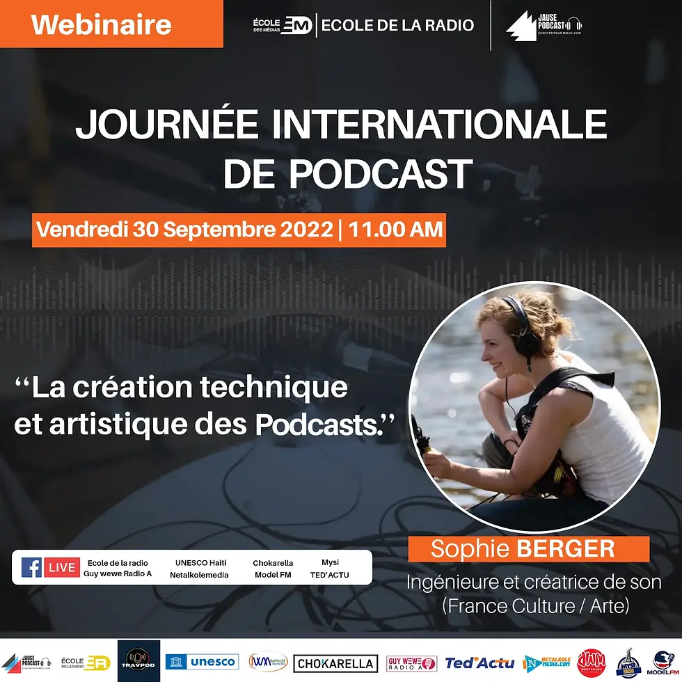 1) Un webinaire ce vendredi 30 septembre à compter de 10hrs (heure haïtienne), avec 4 invité•e•s de marque : Sophie BERGER, ingénieure et créatrice de sons, qui a travaillé pour France Culture, Arte, RFI ; Ravensley BOISROND, jeune journaliste et podcasteur haïtien qui travaille pour NETALKOLE, TRAVPROD ; Steven JAMBOT journaliste et producteur à RFI (L’Atelier des Médias) ; Jause VARIN, diplomate, journaliste à RTVC et créateur de podcasts à JAUSE PODCAST.